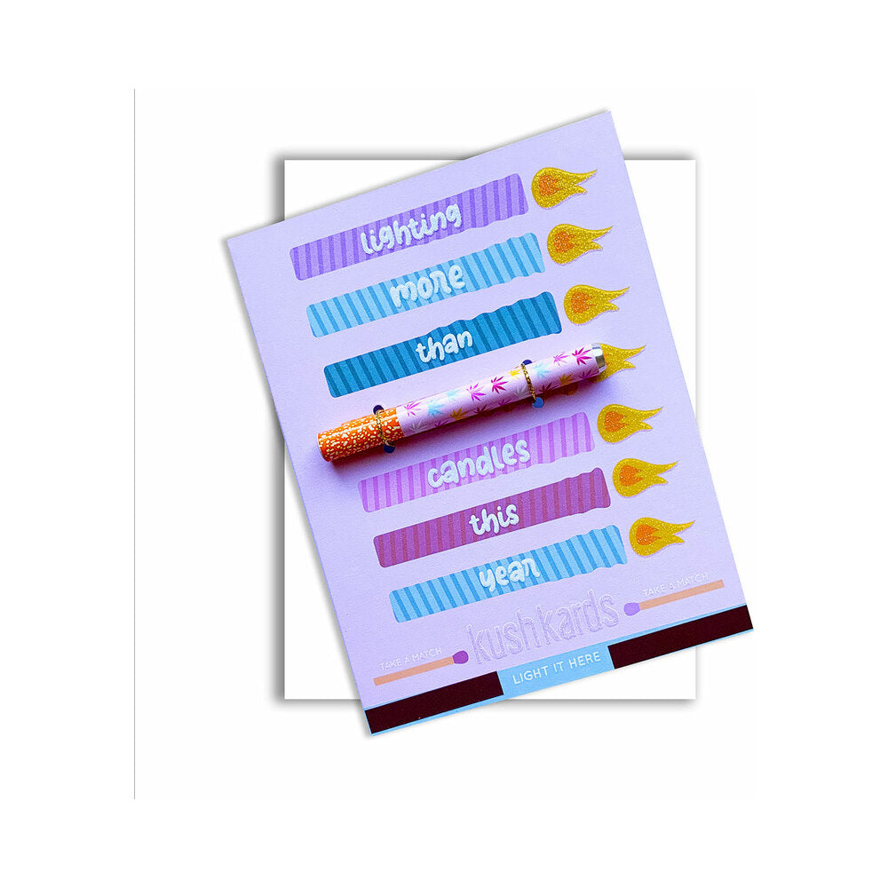 Lighting More Than Candles Birthday One Hitter Kush Kard Because what stoner isn’t lighting more than just candles? The Lighting More Than Candles Cannabis Greeting Card is for those ready to get lit. This one of a kind stoner birthday card is top quality with a shine of glitter in the flames. Includes Metal Multicolored One-Hitter Pipe.